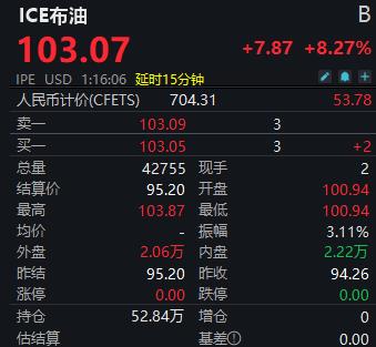 今日邦际油价年夜幅下启,往后延续涨势。停止收稿,WTI本油期货涨8.13%报104.42美圆/桶,布伦特本油期货涨8.27%报103.07美圆/桶。