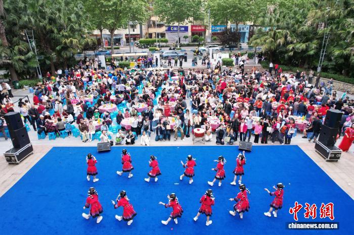 图为百家宴现场,住户边品味好食边望文艺上演。旧鑫 摄